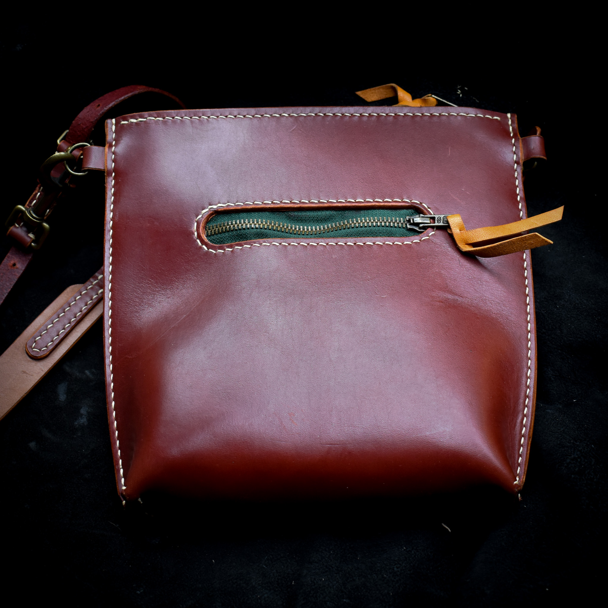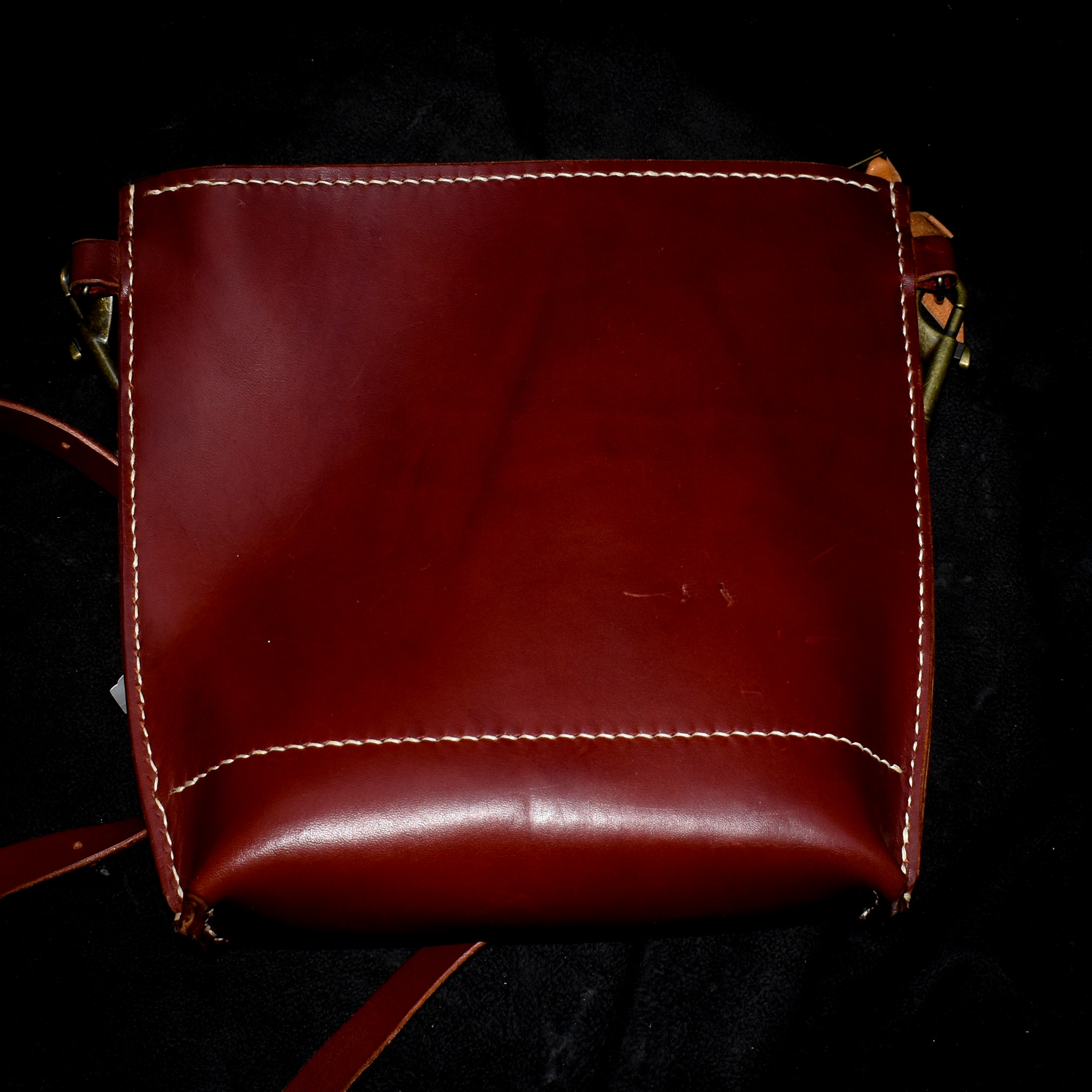 Handsydd axelväska i vegetabiliskt garvat läder från Tärnsjö garveri, med beslag i antik mässing, tillverkat av mig, Fru Läder i Örebro, Sverige.