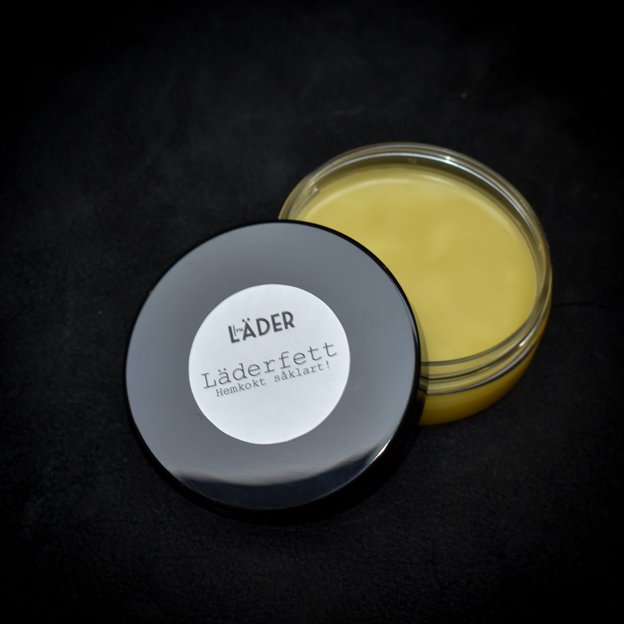 Läderfett som innehåller bivax, ullfett, mandelolja och ricinolja som jag kokar hemma i köket. Detta fett använder jag till alla mina alster och har gjort så i många år.