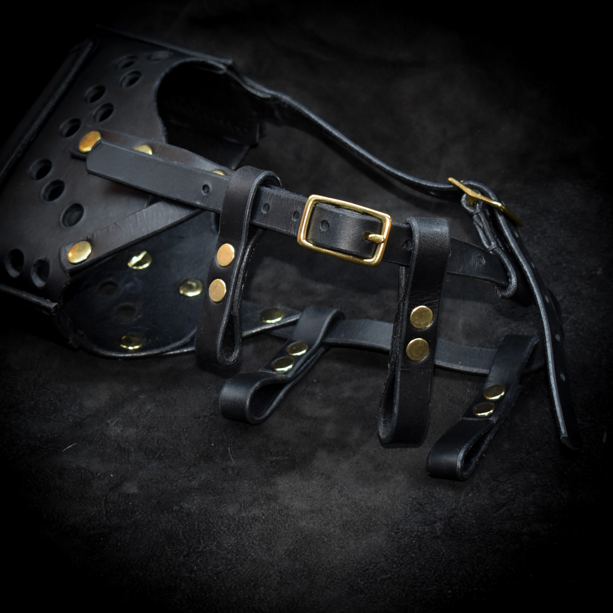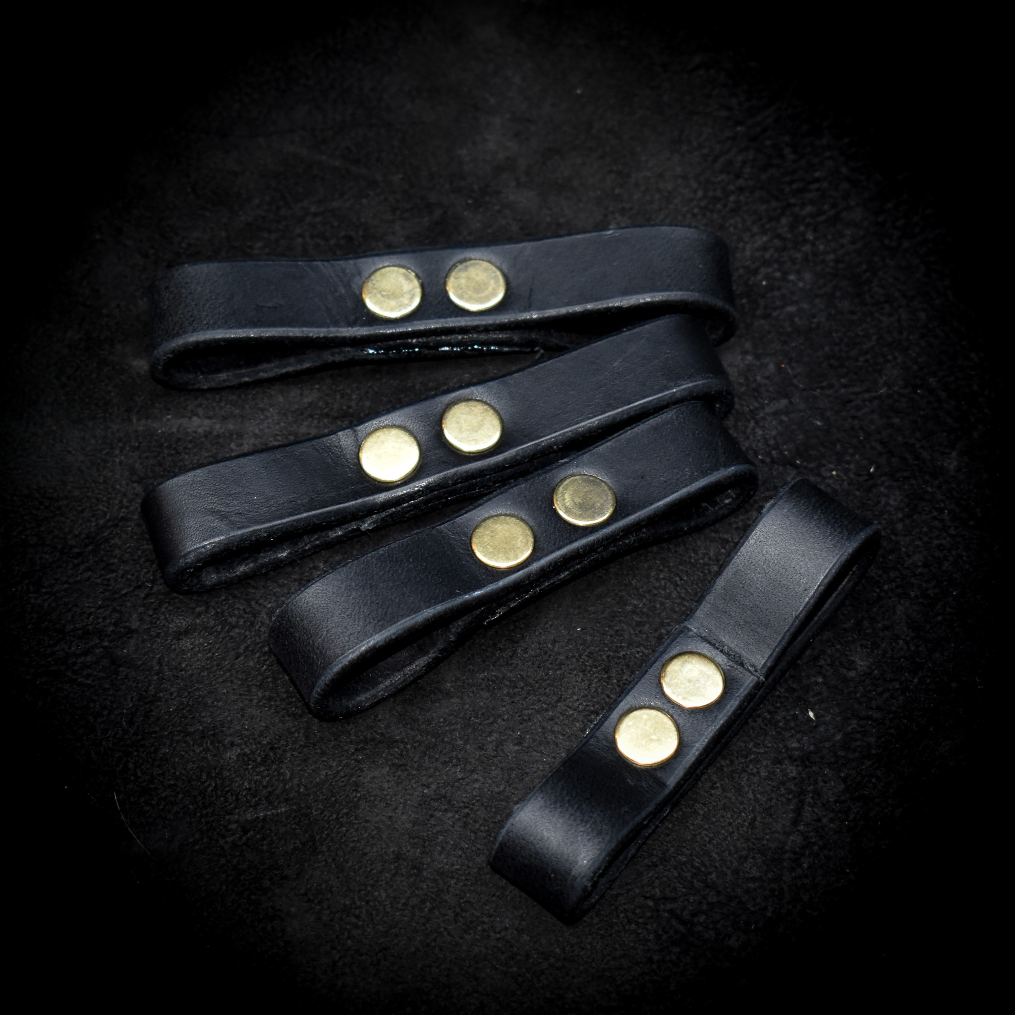 Öglorna är tillverkade i 1,5cm brett, svart, vegetabiliskt garvat läder från Tärnsjö garveri, nitade med guldfärgade nitar och de är anpassade för 1,5cm breda remmar med nätta spännen i både munkorg och halsband. Önskas annan färg på läder eller nitar, bredd på munkorgens remmar eller halsband så skriv det i kommentarsfältet vid utcheckning eller Kontakta mig.